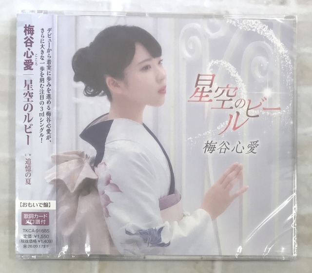 2023年、15歳でシングル「磐越西線ひとり」で衝撃のデビュー。以来、澄んだ声と抜群の歌心は大きな話題を呼び、第66回 輝く!日本レコード大賞新人賞受賞するなど、その表現力で日々存在感を増している梅谷心愛の大きな一歩を刻むべくリリースする大注目の3rdシングル。表題曲「星空のルビー」は、心の奥に灯り続けるひとすじの希望を、澄んだ星空に重ね歌い、十代の儚い恋の情景を描いたドラマティックな一曲。まだ大人になる前に抱いた夢、叶えたかった未来、胸にしまい込んでいた想い。それらがルビーのように鮮やかにきらめき、聴く人それぞれの記憶を優しく照らす。梅谷心愛ならではの解釈で表現した純度の高い歌謡ナンバー。伸びやかでまっすぐなロングトーンや温度のある感情表現に梅谷の歌手として確かな成熟を感じ取る事が出来るノスタルジックな注目曲。 Disc.1 01.星空のルビー(4:15) 02.博多ごころ(3:54) 03.星空のルビー (オリジナル・カラオケ)(4:15) 04.博多ごころ (オリジナル・カラオケ)(3:53) 封入特典 歌詞カード、メロ譜付 未収録曲収録(おもいで盤未収録) TKCA91684
