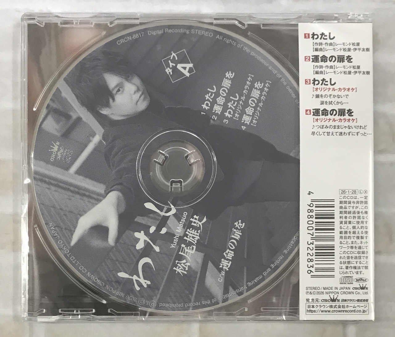 松尾雄史の新曲は、レーモンド松屋作品でリリース!表題曲「わたし」は、女心を歌うレーモンド松屋プロデュース作品。タイプA収録のカップリング曲「運命の扉を」は、「色恋沙汰は~」のサビが印象的なロック調の歌謡曲。