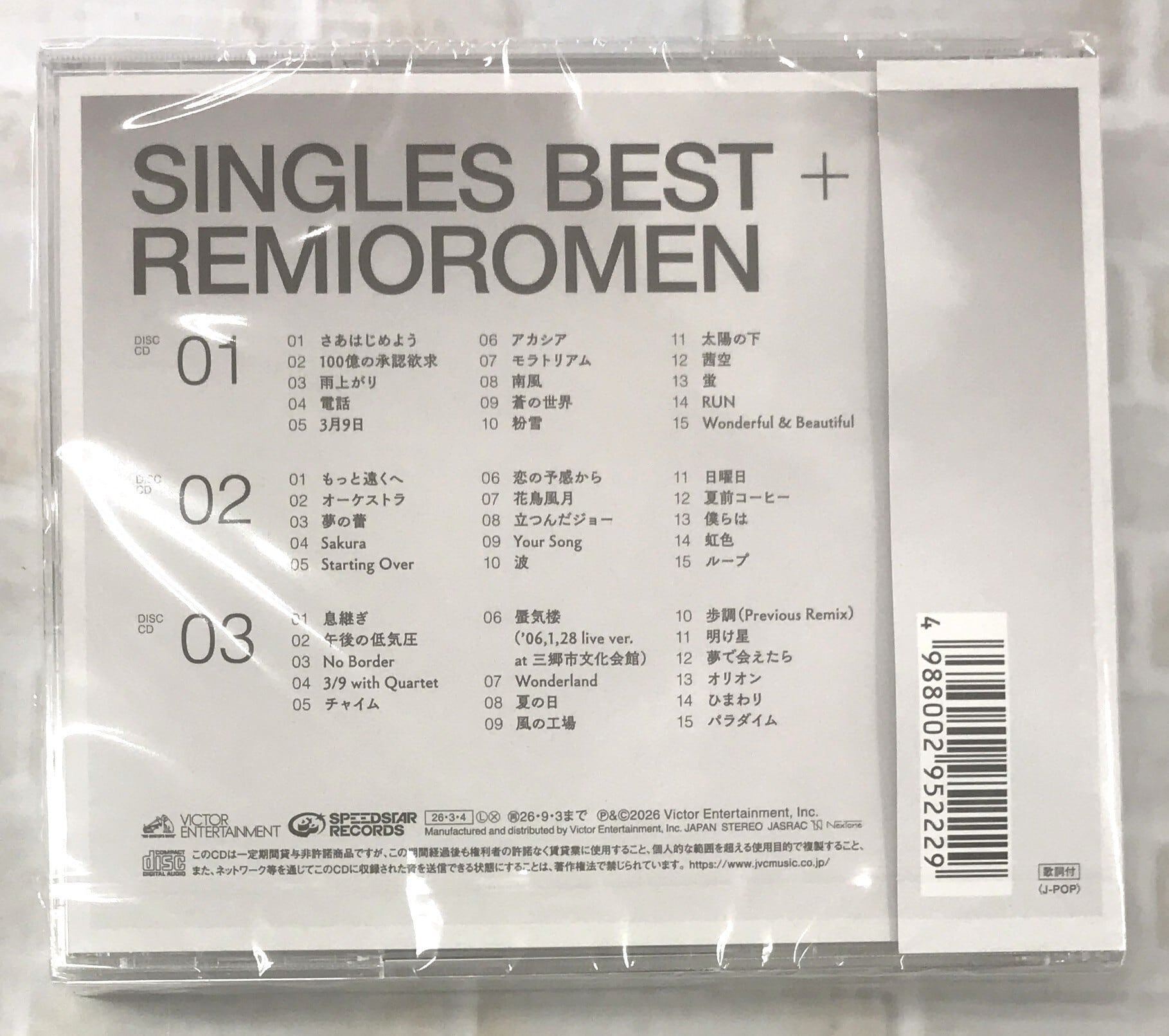 レミオロメン、2012年の活動休止以来14年ぶりとなる活動再開が決定!2026年3月9日より、約15年ぶりとなる全国ツアーの開催直前にリリースされる、シングルズ・ベストアルバム。本作は2003年~2011年の9年間にリリースされたシングル22 曲に、アルバム未収録のカップリング曲19曲、インディーズ ミニAL「フェスタ」に収録されオリジナル AL には未収録の「波」、2007年完全生産限定でキットカット CD パックとして発売され、現在入手困難となっている「パラダイム」の43曲と、更に新曲を収録しCD3枚組豪華なボリュームでリリース。