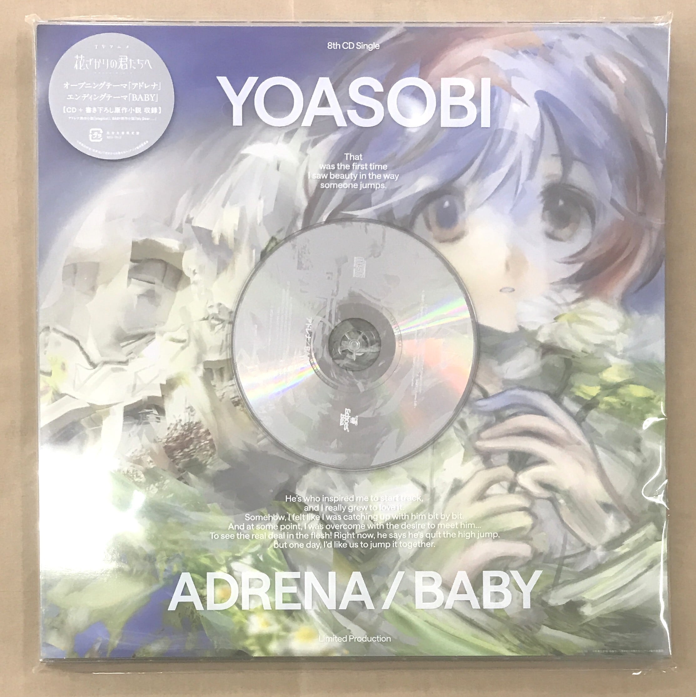 2026年1月より放送開始となる TVアニメ『花ざかりの君たちへ』のオープニングテーマ&エンディングテーマをYOASOBIが担当。そのオープニングテーマ「アドレナ」とエンディングテーマ「BABY」を収録した完全生産限定盤シングル。