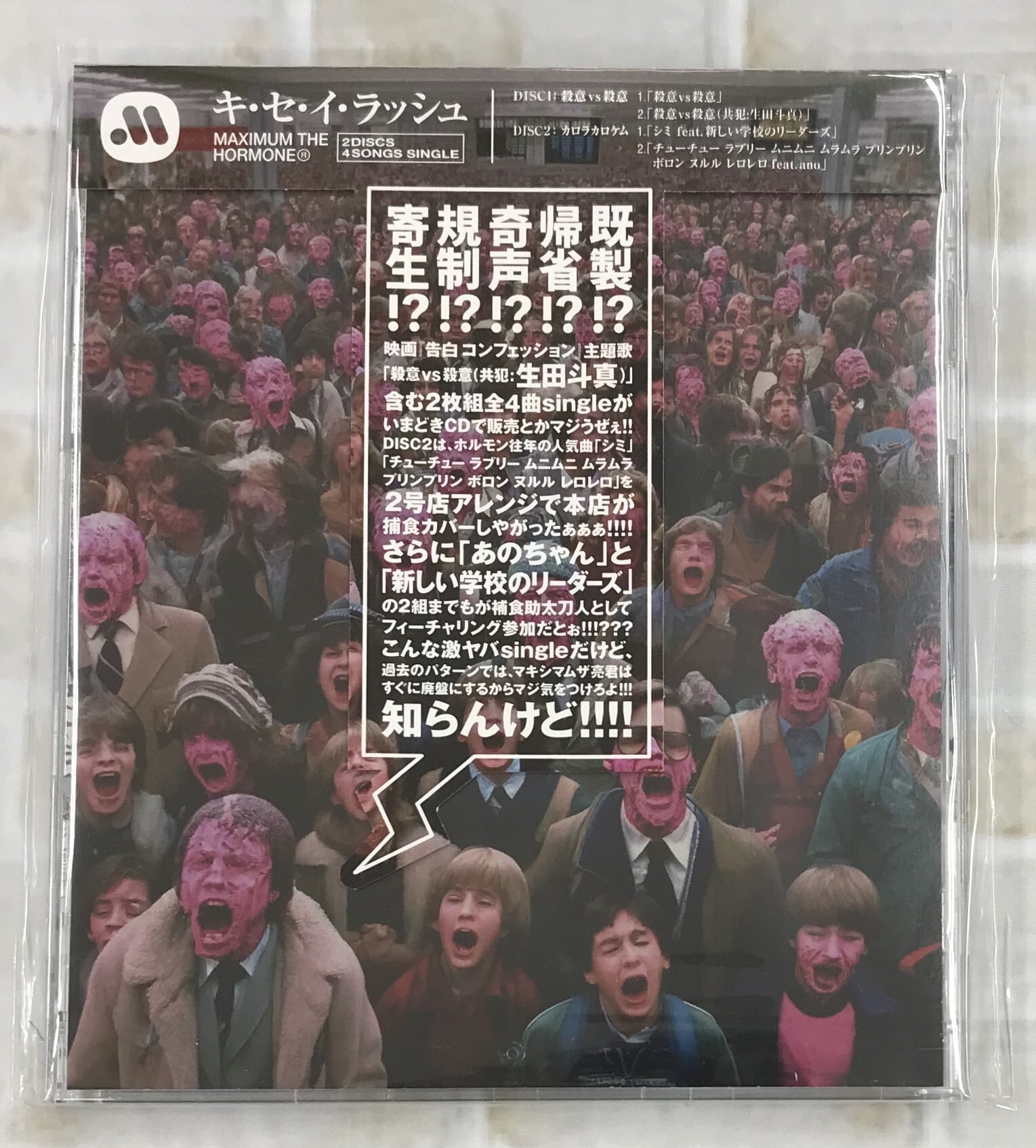 5月31日(金)公開の生田斗真出演映画『告白 コンフェッション』の主題歌であり、生田斗真本人も歌唱している「殺意vs殺意(共犯:生田斗真)」と、同曲のホルモンver.「殺意vs殺意」を収録したDISC1。現時点では謎のCD「カロラカロケム」とされているDISC2の2枚組全4曲入りシングル。